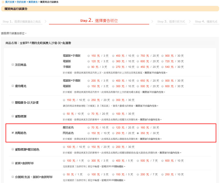 1. 勾選所要購買的廣告產品(如:閃亮底色 30天)