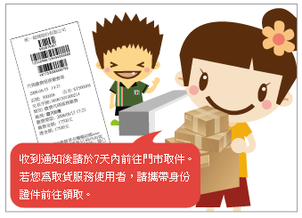 貨品到門市的當天,露天拍賣會以手機簡訊與email通知買家取件時間,買家必須在收到通知後7天內前往門市取件。若買家選用「7-ELEVEN取貨」,需由收件者本人攜帶身份證至門市核對身份並於標籤處簽名後才可領取商品,為了保障您的權益,取貨前請確認貨件資訊,貨件一經領取,即無法接受退回。