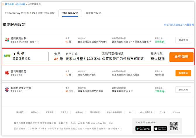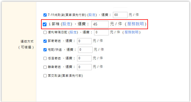 您也可以在商品上架頁的【運送方式】欄位中,於「i郵箱」後點選"設定"進行。