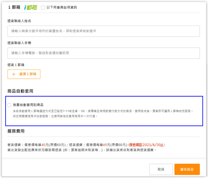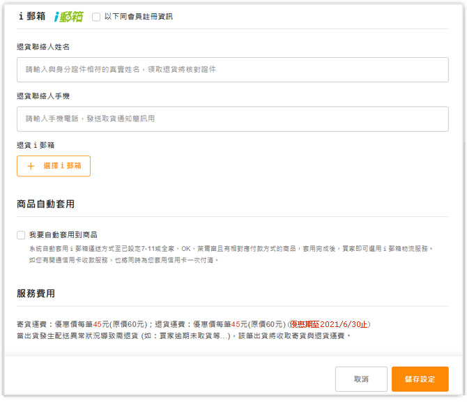 設定退貨人資訊及退貨i郵箱等相關欄位內容。按下"儲存設定",服務即申請成功。