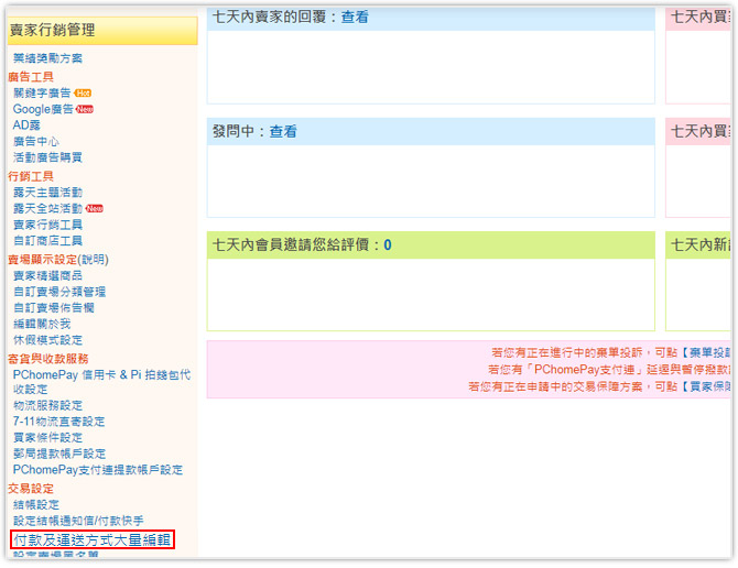 您也可以在「我的拍賣」中,透過『付款及運送方式大量編輯』設定所有出售中商品的付款及運送方式。