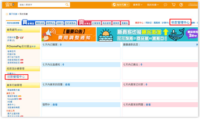 您可從「我的拍賣」中找到【收款及計費管理】區,點選 [收款管理中心] 進入「露天代收帳戶」。