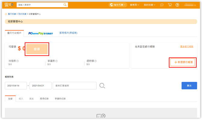 進入「露天代收帳戶」後,若您未完成提領設定時,可點擊提領或新增銀行帳號,進行提領銀行帳號認證流程。