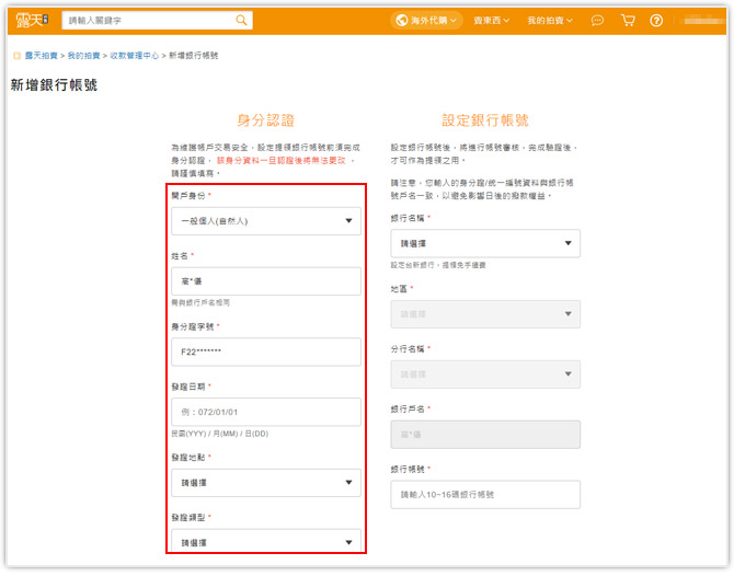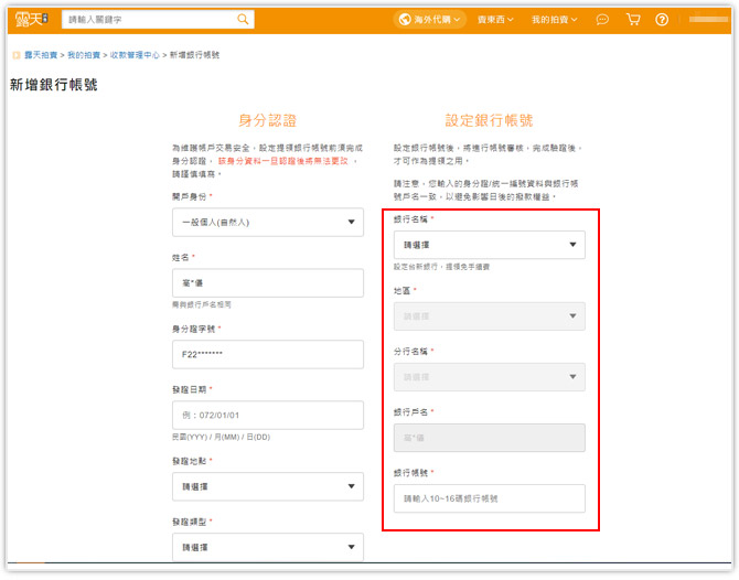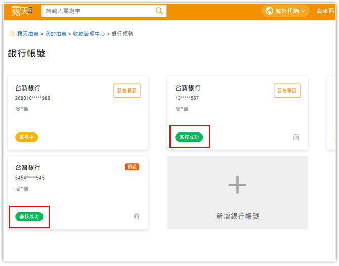 step5 . 您也可自行至「露天代收帳戶」中的「銀行帳號」查看審核結果。