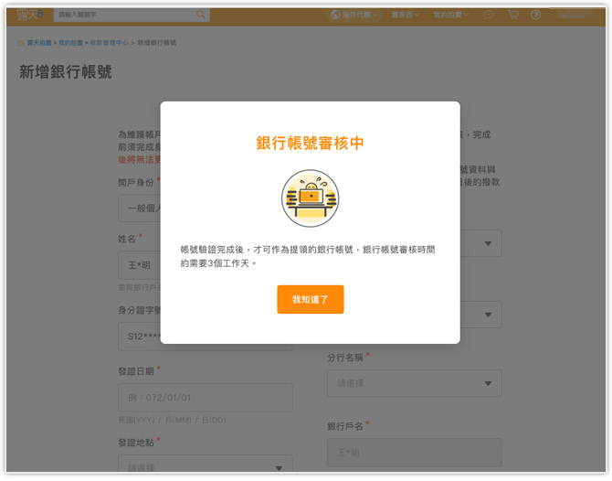 約3個工作天後,系統會通知您銀行帳號的審核結果。