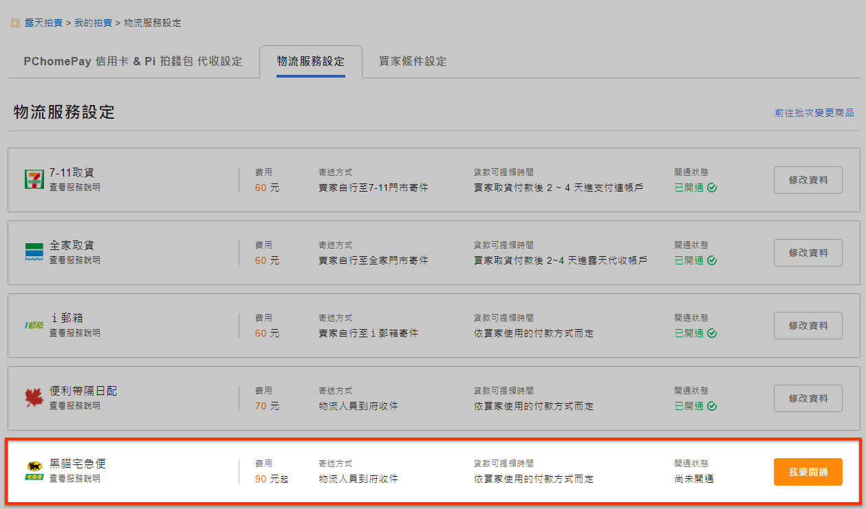 於「黑貓宅急便」點選"我要開通"進行設定。