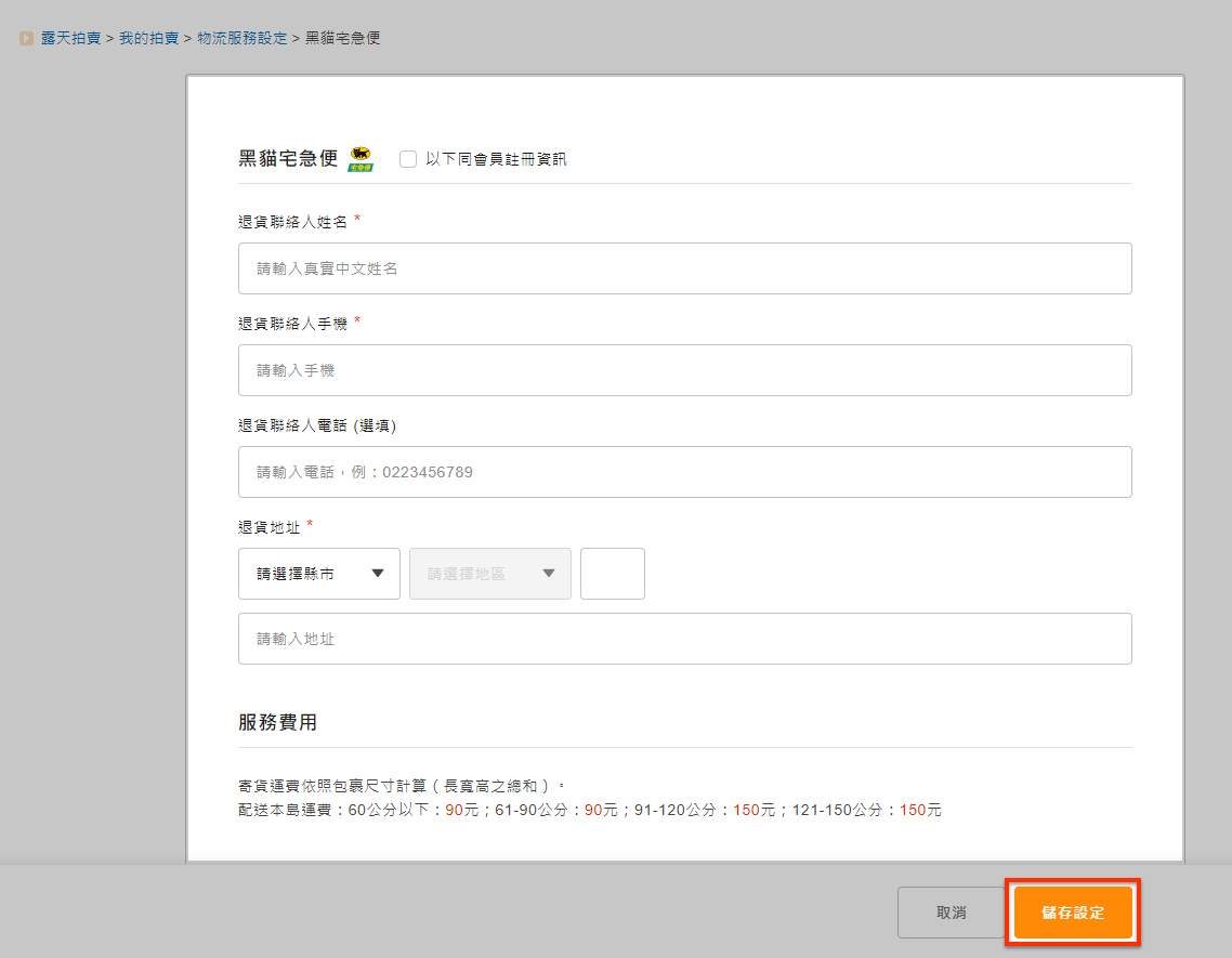 設定退貨人資訊及退貨地址等相關欄位內容。按下"儲存設定",服務即申請成功。