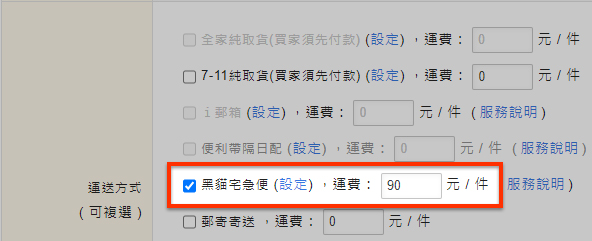 您也可以在商品上架頁的【運送方式】欄位中,於「黑貓宅急便」後點選"設定"進行。