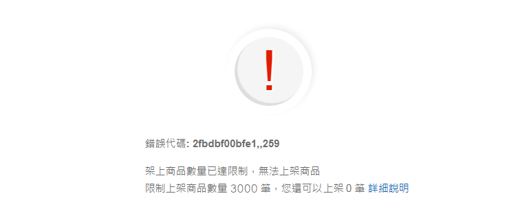 若已經超過數量上限,再進行上架時,會顯示"架上商品數量已達限制,無法上架商品"